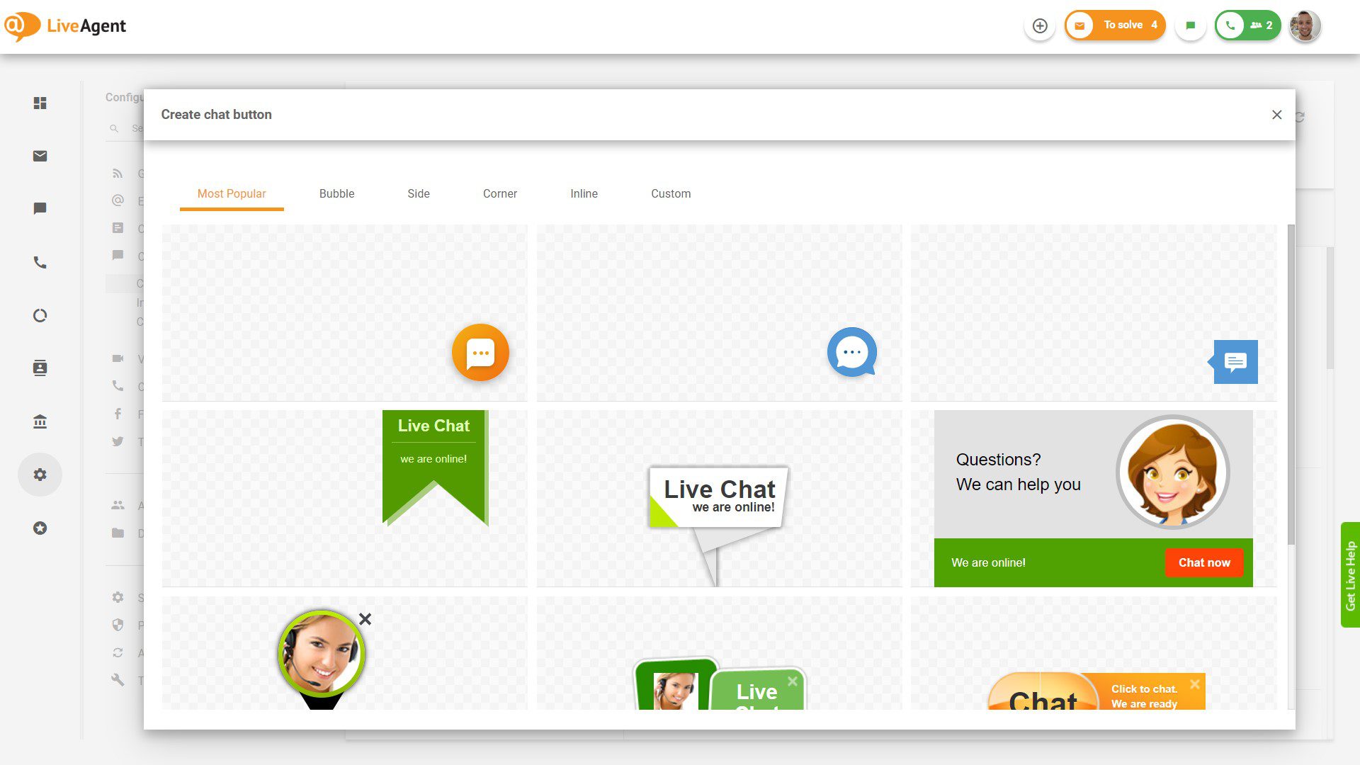 Internetinių pokalbių programinė įranga jus įgalina lengvai pritaikyti jau egzistuojančius mygtukus arba susikurti naujus. Kai pritaikysite mygtuką, jums liks tik jį integruoti, savo puslapyje patalpinant (nukopijuoti ir įklijuoti) iš anksto sugeneruotą kodą.
