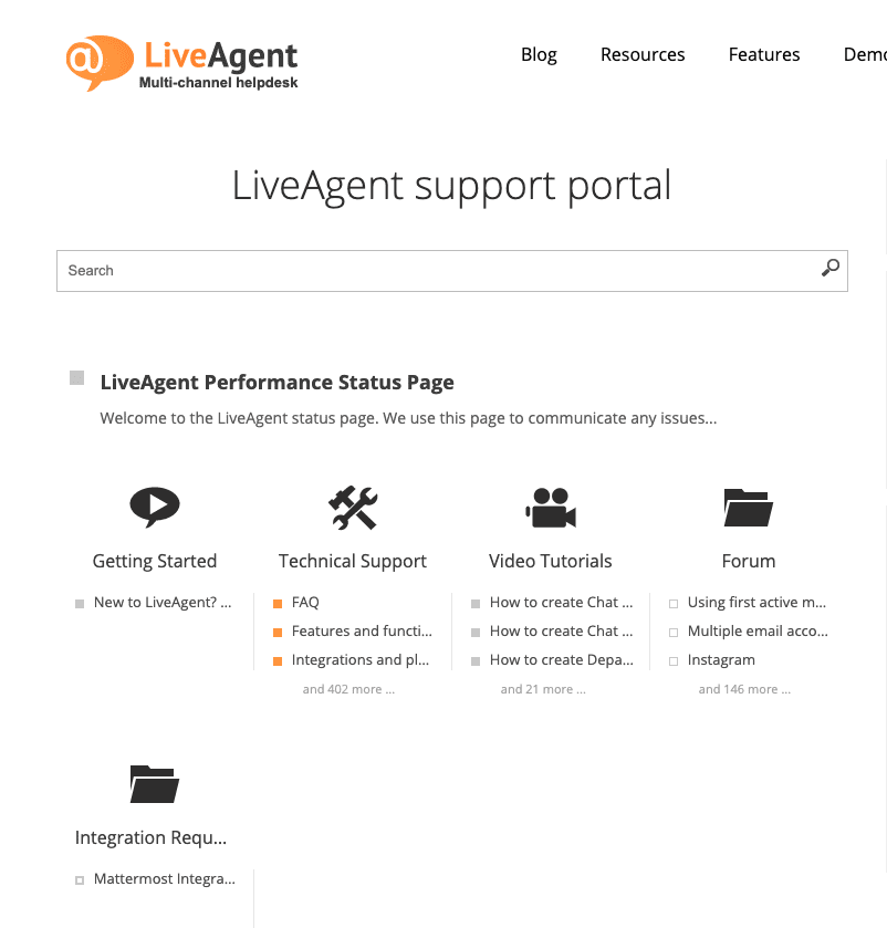 LiveAgent siūlo daugybę funkcijų, padedančių įmonėms užmegzti ryšį su klientais. Ji taip pat siūlo klientams didelę išteklių biblioteką. Šie ištekliai apima tinklaraščių įrašus, šablonus, žodynėlius, spausdinimo testus, WordPress įskiepį, katalogus, internetinius seminarus, akademiją ir dar daugiau.