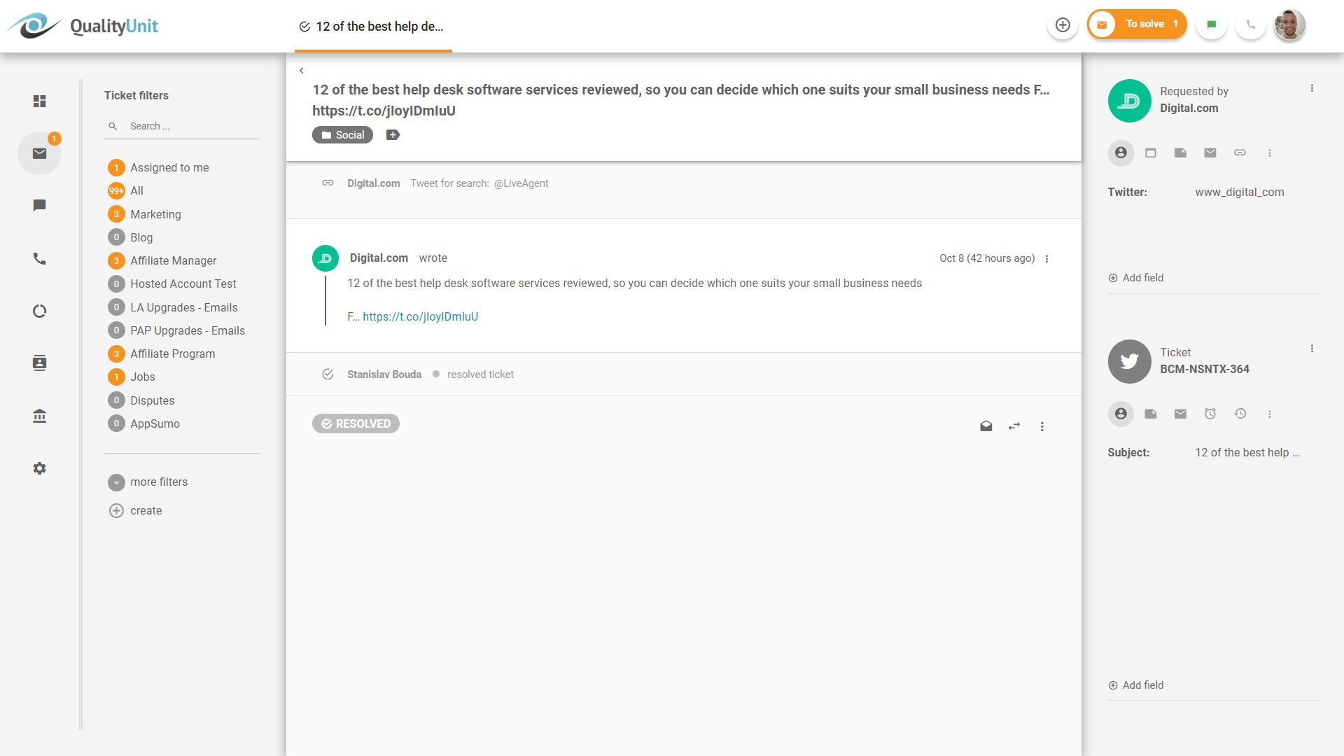 Trūksta bendro vaizdo? Socialinių tinklų pagalbos tarnybos alternatyva užtikrina, kad darysite kuo mažiau sustojimų! Sekite kiekvieno kliento problemų sprendimo kelionę per visus kanalus – tiesioginį pokalbį, socialinius tinklus, el. paštą ar telefoną – vienoje bilieto gijoje. Tai taip paprasta!